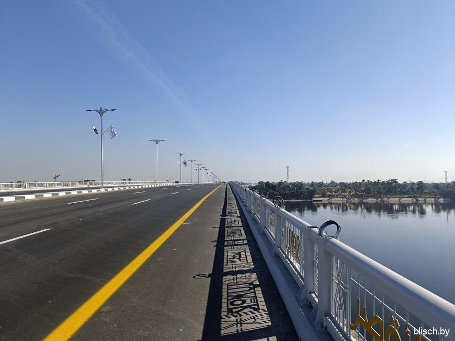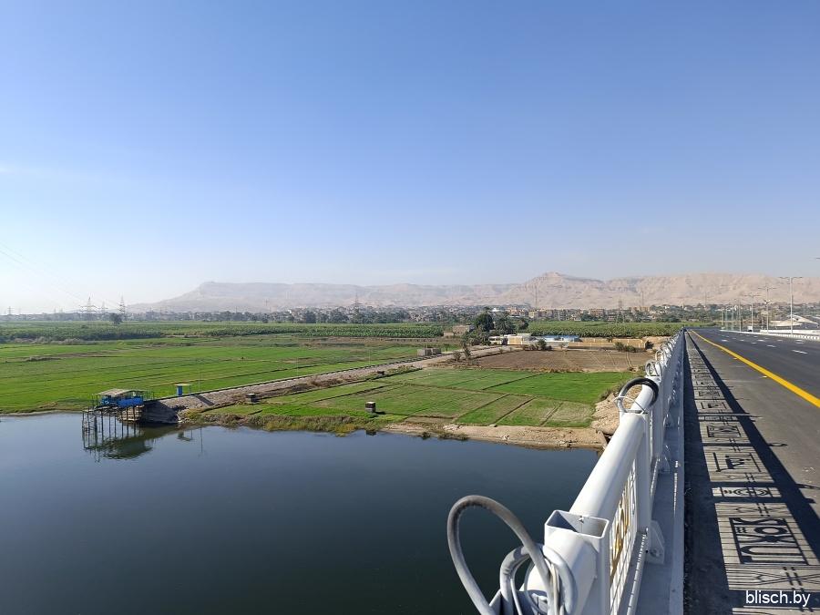 Это, кстати, Нил. Специально попросил остановиться на мосту, чтобы посмотреть на реку с такой точки. Хорошо видно, что вдоль берегов земля обрабатывается и зеленеет свежими всходами, а вдалеке песок и камни.