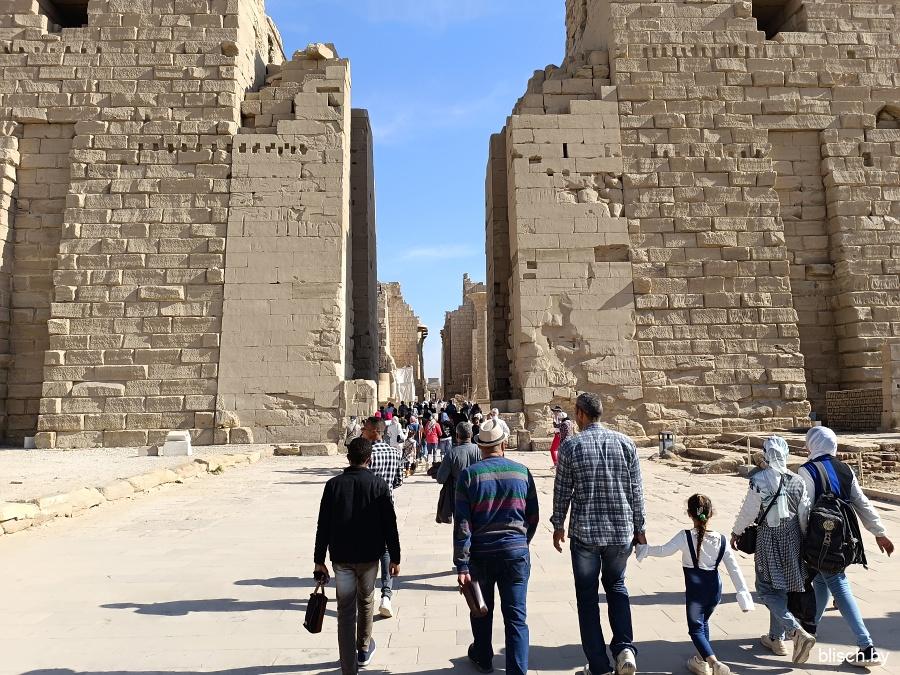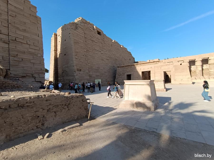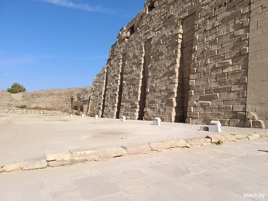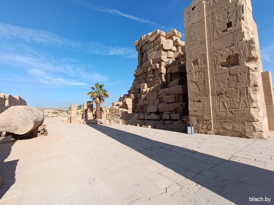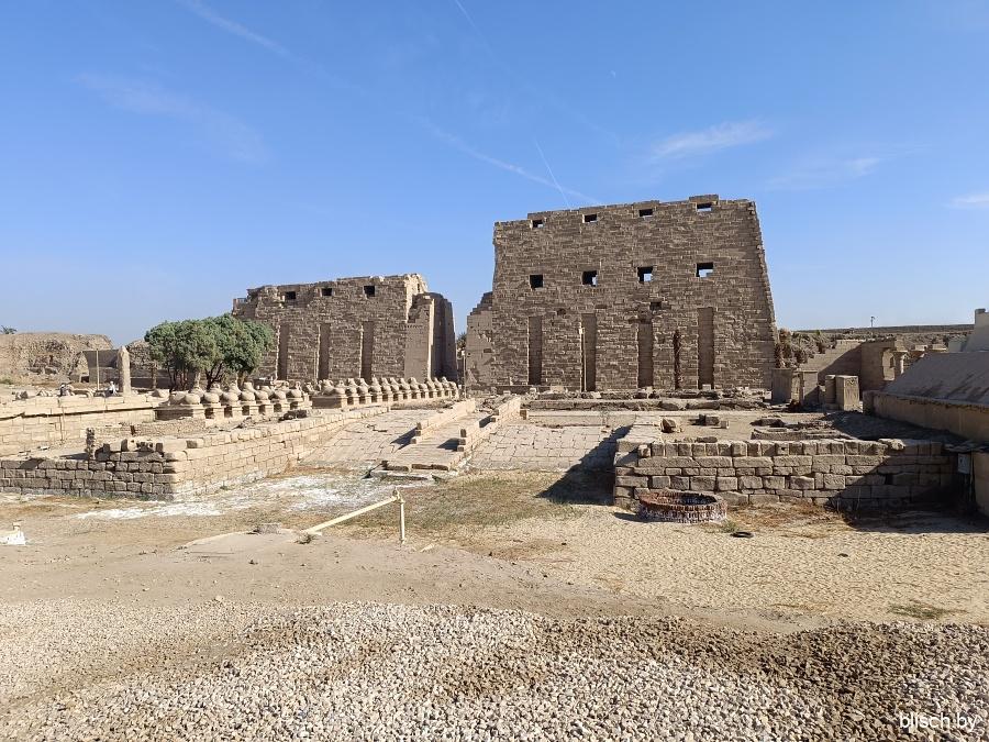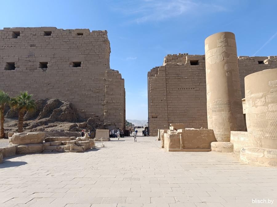 Посетители попадают внутрь территории через гигантский 45-метровый пилон. Он продукт реставрации, хотя и сделанной ровно из тех материалов, что использовали древние египтяне — блоки пилона с открытием храма валялись у портала в хаотическом порядке.