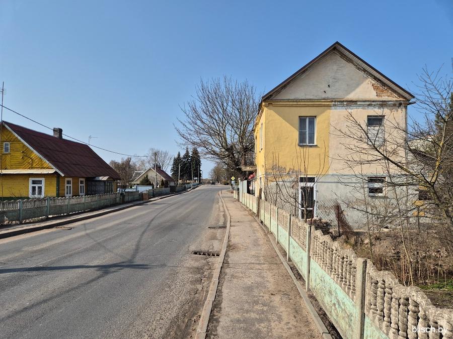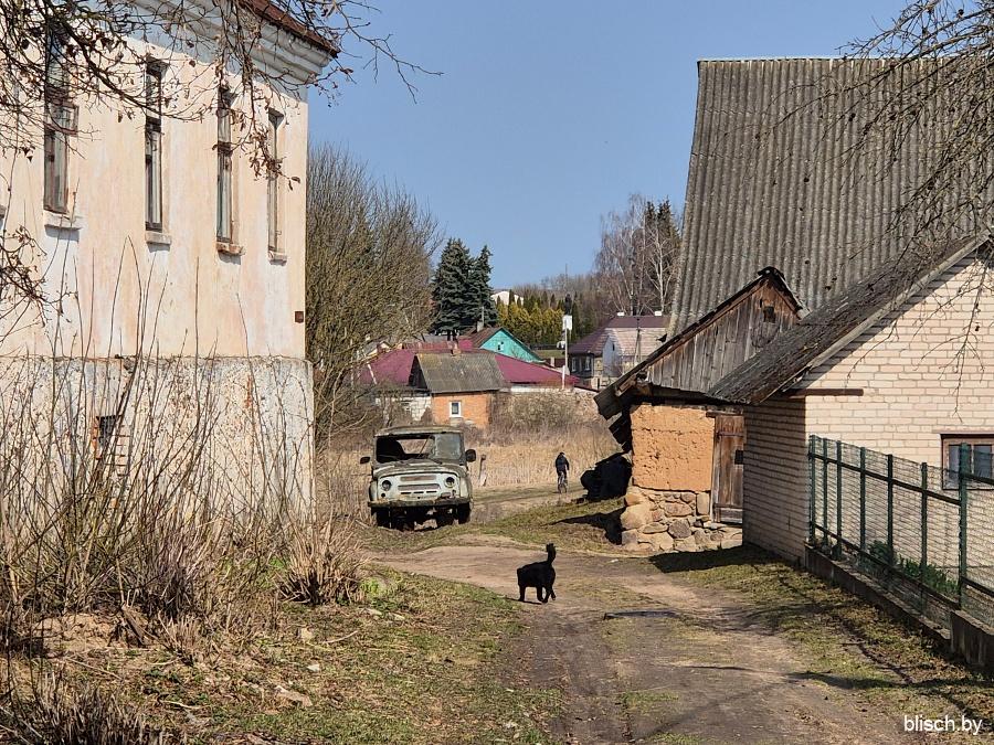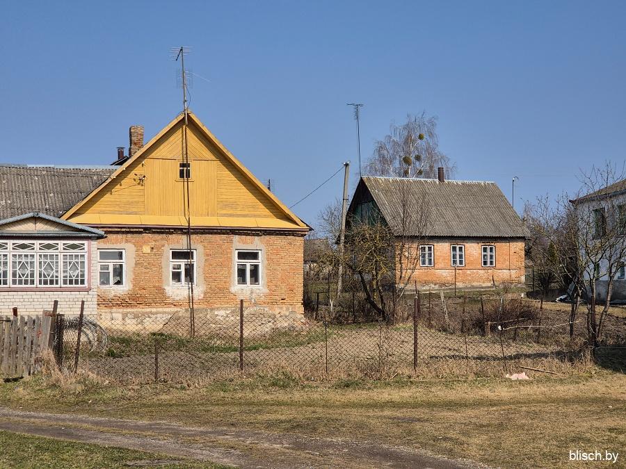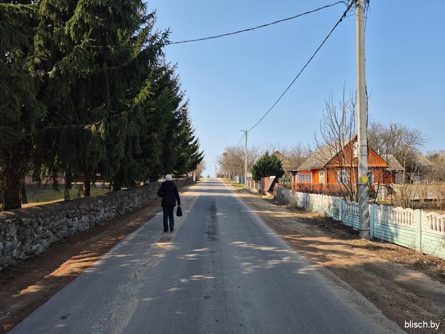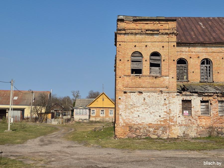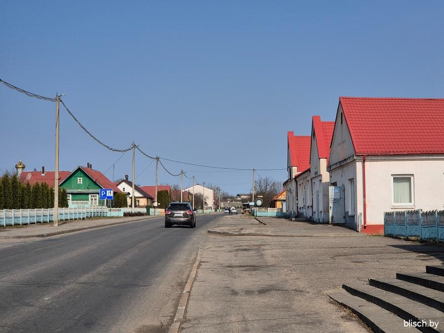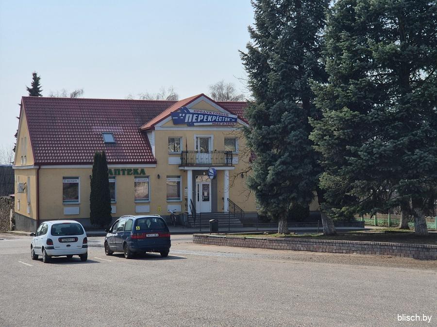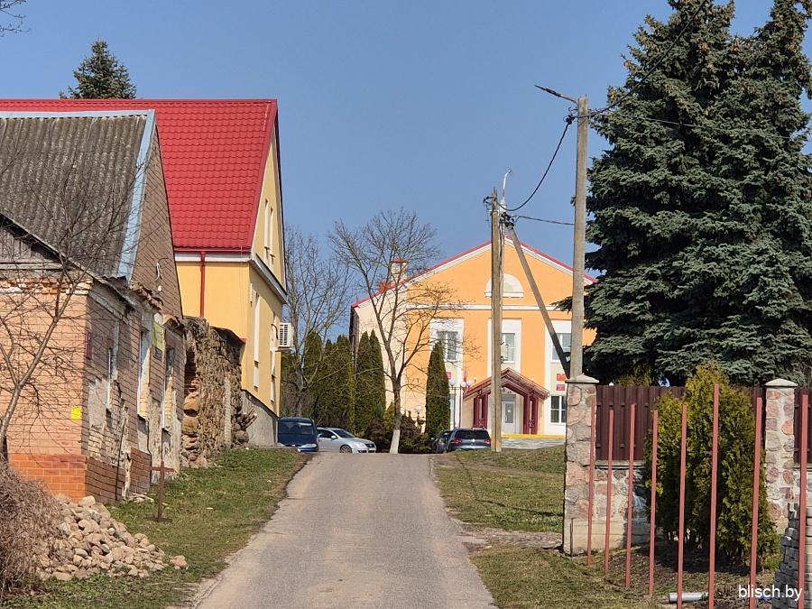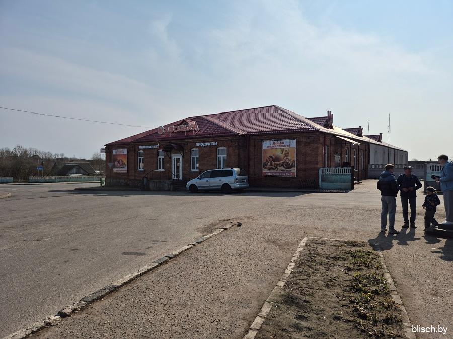 Общественный транспорт делает остановку в деревне у магазина в старинном кирпичном здании на пересечении Гродненской и Северной улиц: