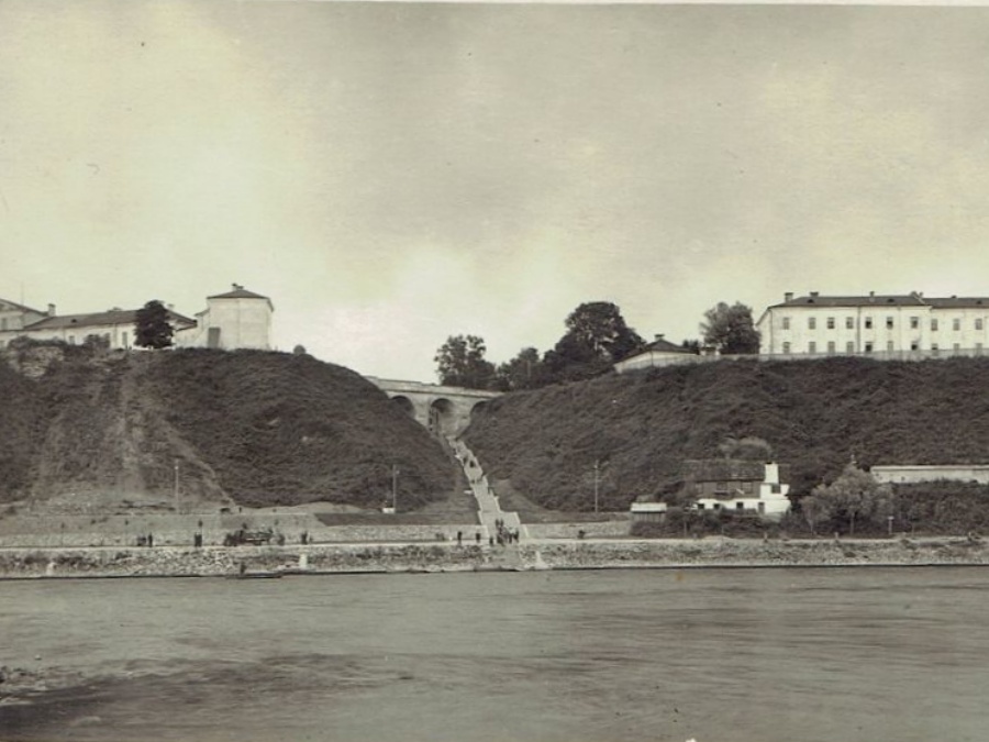 Исторических снимков Нового замка довольно много, но подавляющее их большинство относится к XX веку. Старейший из найденных мной отпечатков относится к 1890-му и сделан как раз с противоположной стороны реки. В работу, правда, я взял другой, от 1937-го, потому что его удобнее было сопоставить с текущим положением дел: