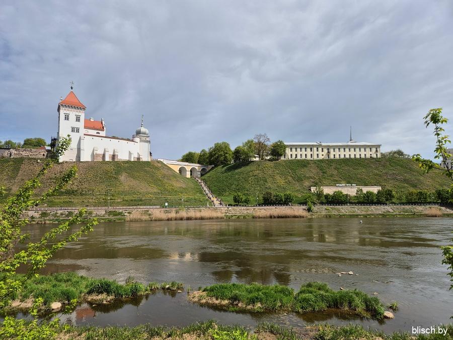 Если не полениться и съездить на другой берег Немана, то откроется полная панорама обоих замков Гродно. Отсюда, кстати, хорошо видно, что Старый в плане является треугольником — это довольно необычно. Новый же лишь чуть возвышается над обрывом, имея строгий, практически модернистский профиль.