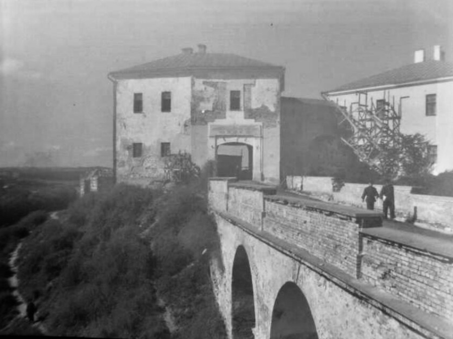 Снимок от 1930-го года с классической позиции, где виден мост и барбакан замка. Видно, что оригинальный виадук XVIII века (старейший мост Беларуси если что) дошел до нас без изменений: