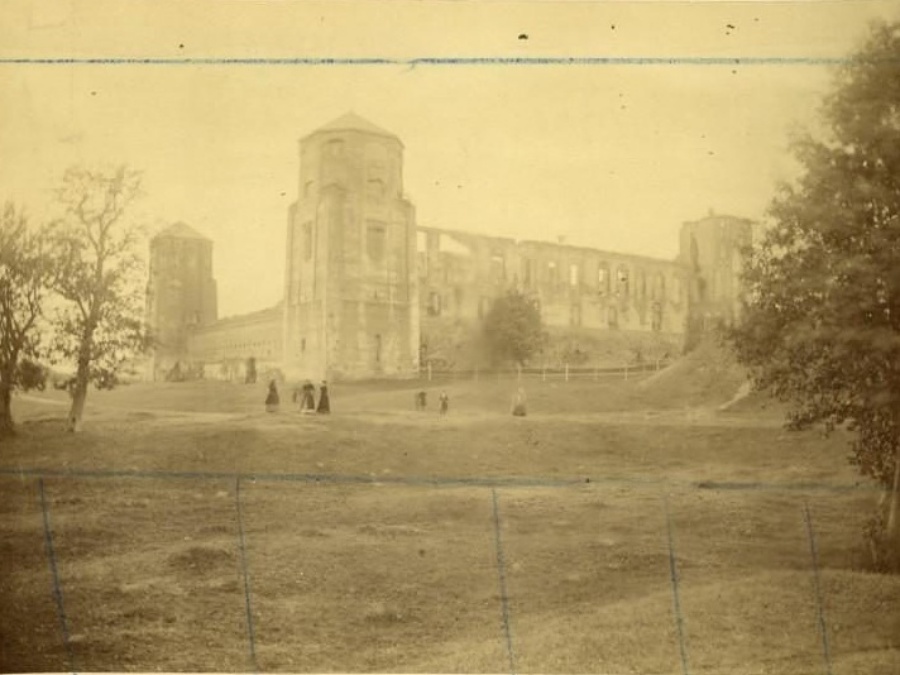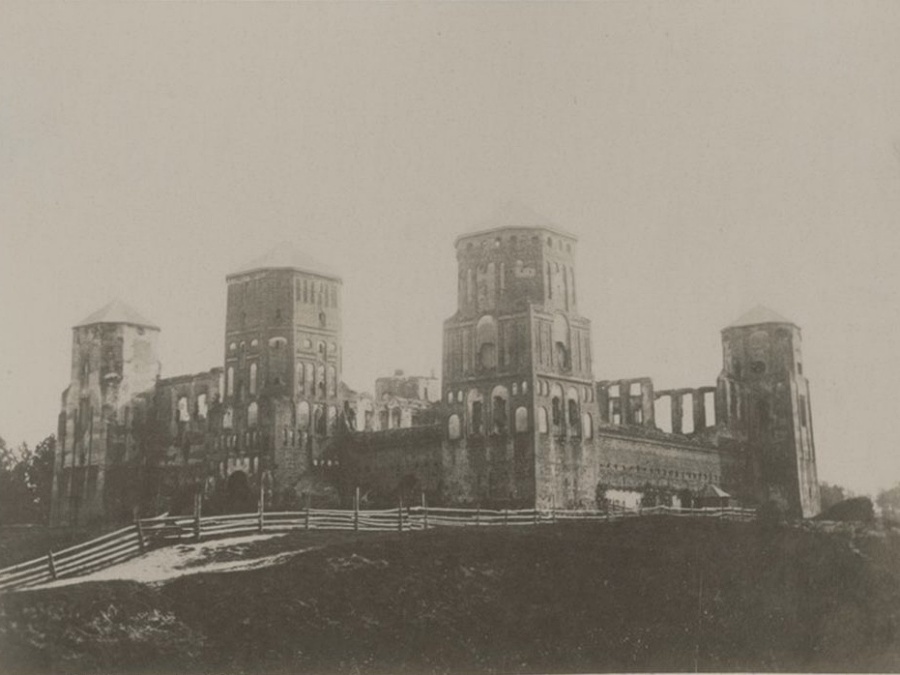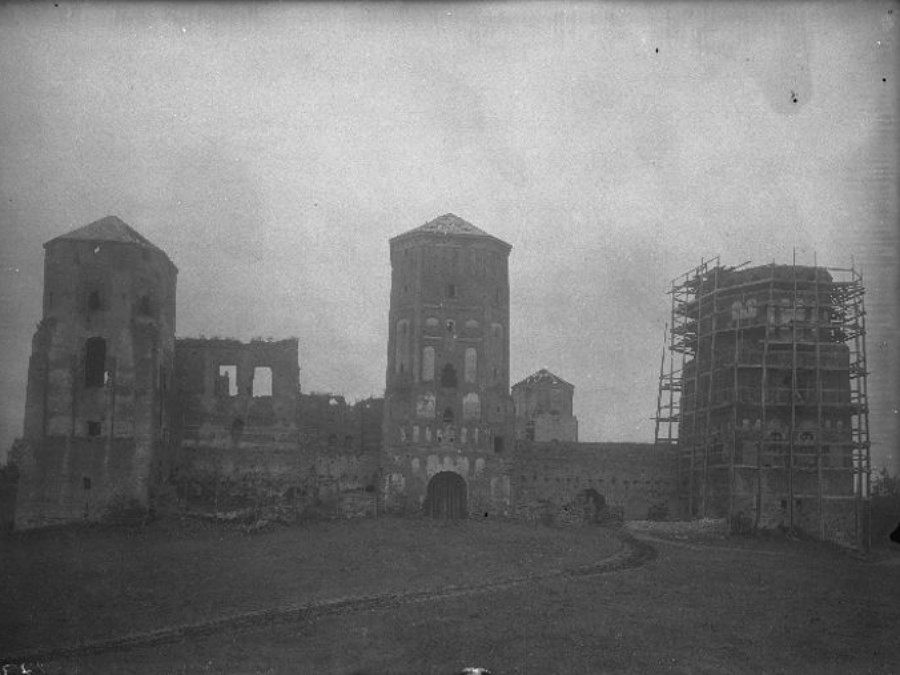 Мирский замок попадал и на очень старые литографии, и был зарисован Наполеоном Ордой, и, конечно, с изобретением фотоаппарата становился объектом фотофиксации. Самую старую фотку, что мне удалось найти, кто-то сделал в 1895-м году: она полезна тем, что на ней видны временные кровли башен, призванные законсервировать постройку и защитить ее от разрушения. Считается первой архитектурной консервацией на территории современной Беларуси (сделана она во второй половине XIX столетия).