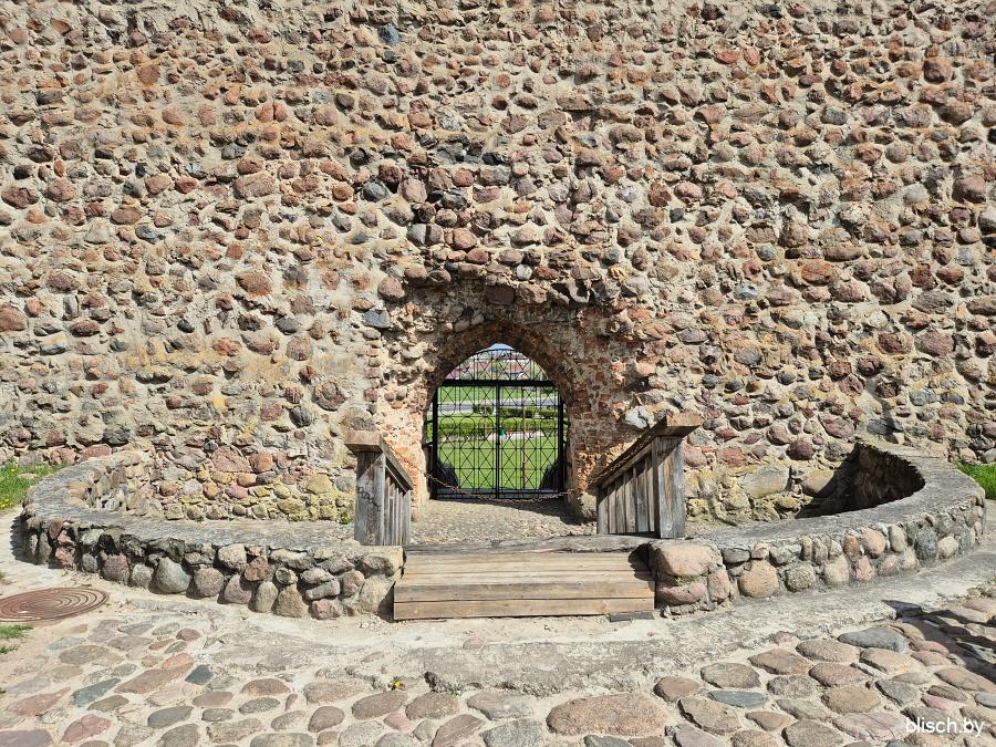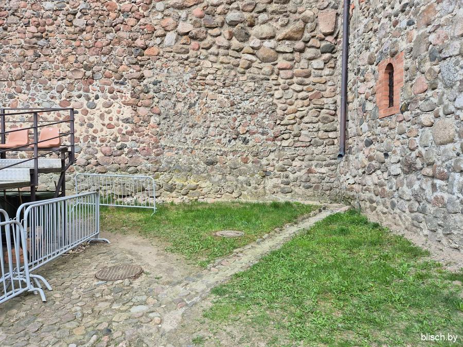 Еще одно характерное отверстие расположено на восточной стене замка. Сейчас оно используется как дополнительный выход, что-то вроде пожарного, и в постоянном режиме закрыто на замок. Видно, что был снят слой земли, раскрывший истинный размер арки.