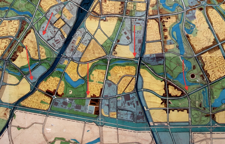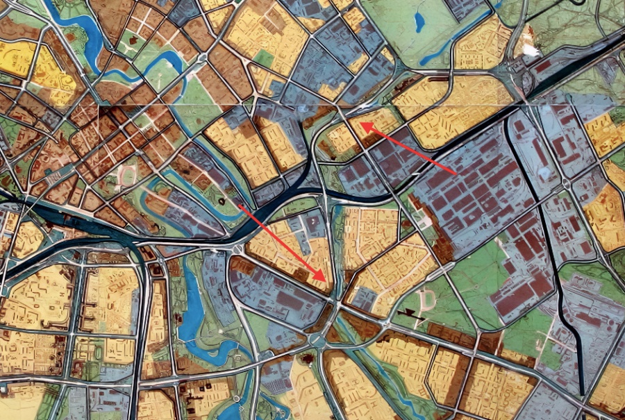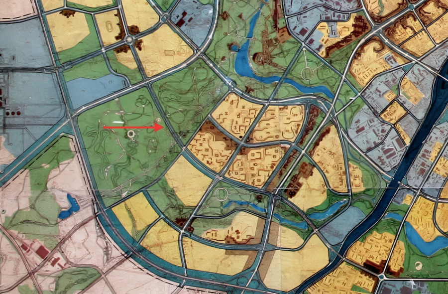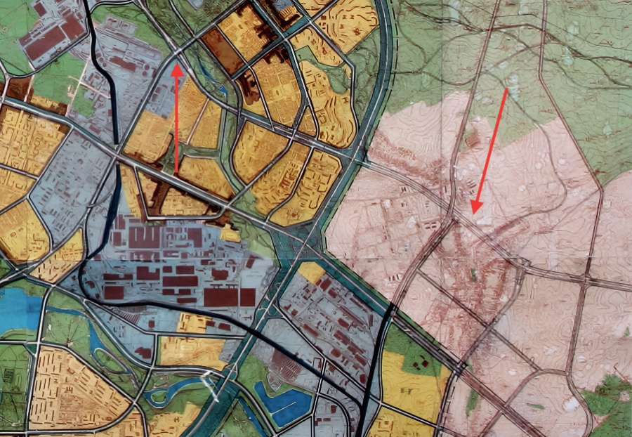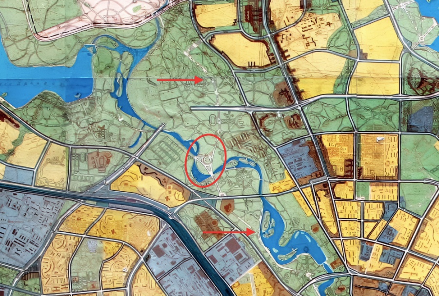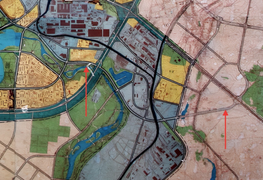 Наконец, через зеленый диаметр города в планах была проложена некая дорога… Наверное, велодорожка? С целыми развязками и переходом куда-то в сторону Новинок.