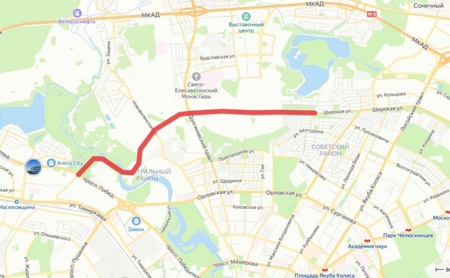 Та часть Северного Берега, что строится сейчас, то есть между Цнянским водохранилищем и Новинками, имеет классическую квартальную нарезку с сеткой основных и второстепенных улиц в долготном и широтном направлениях. Так, с юга на север главной артерией следует считать улицу имени Иосифа Лангбарда, а с запада на восток продолжение Будславской, берущей начало еще на Долгиновском тракте. Но в широтном направлении к Будславской будет добавлен широкий проспект в составе нового участка третьего транспортного кольца — он станет продолжением Широкой, пересечет большую часть Северного Берега, перейдет через Свислочь неподалеку от футбольного манежа и вольется в Радужную (о том, как перестроится Радужная и Лынькова я уже рассказывал в отдельном тексте)