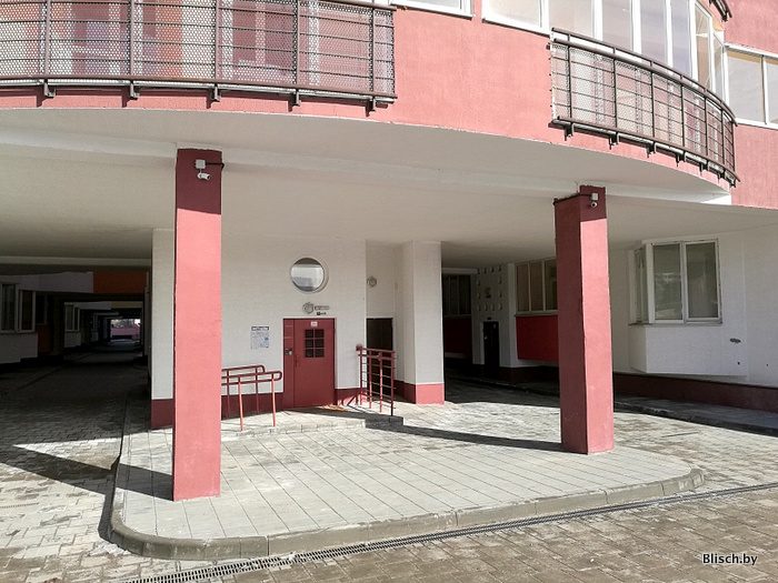 У этого дома есть внутренний двор, в который можно попасть по лестнице, поднимающей на платформу полуподземного паркинга: