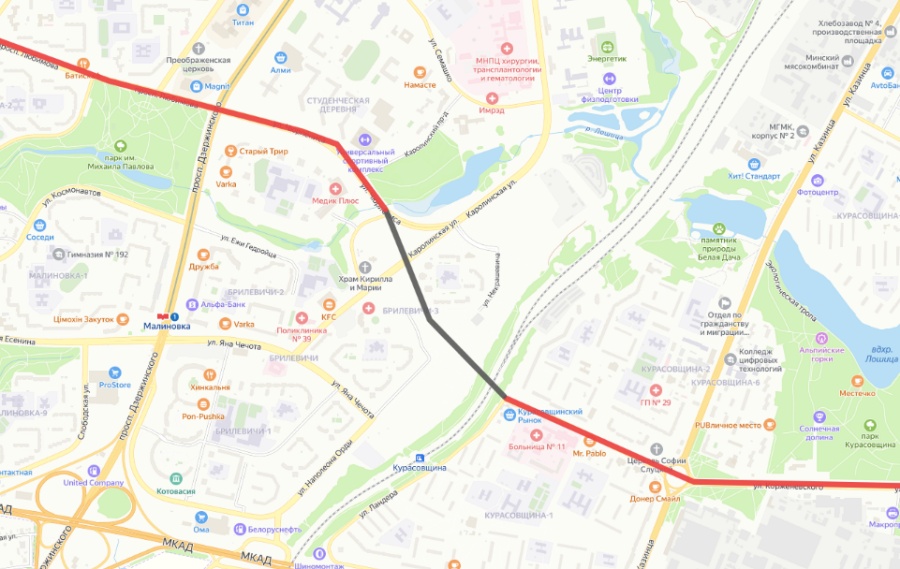 Со времени строительства жилых микрорайонов Курасовщины коридор под магистраль остается. Придется сносить гаражи и железнодорожные подъездные пути на заводы «Керамин» и «Крион». Вот тут: