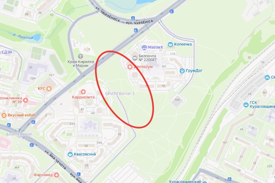 Корженевского придется расширять на всем протяжении, но и под это оставлено место аж в 70-х годах XX века. Она перейдет через железную дорогу на Брест, рассечет на две части Брилевичи-3 и соединится с Чюрлениса: