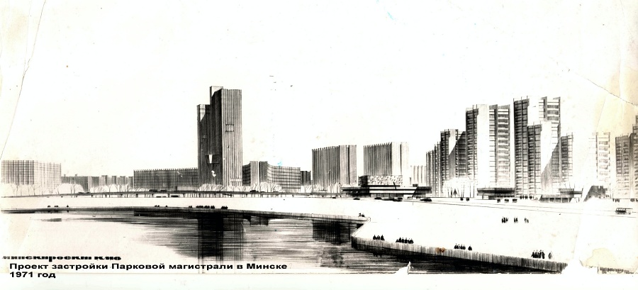 Один из набросков облика Парковой магистрали авторства Валентина Круся. Угадывается будущая гостиница «Планета» (но без второго корпуса), комплекс Минтруда и даже высотный акцент, не реализованный тогда, но позже ставший ЖК «Славянский». Жилой квартал еще выглядит не таким, каким вышел по итогу, но черты определенно узнаваемы.