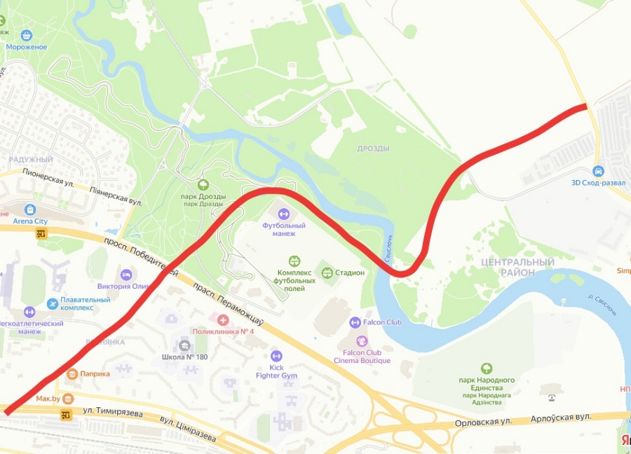 Далее он сделает еще один резкий поворот и по территории бывшей деревни Крупцы выйдет к проспекту Победителей и вольется в Радужную улицу. Примерно так: