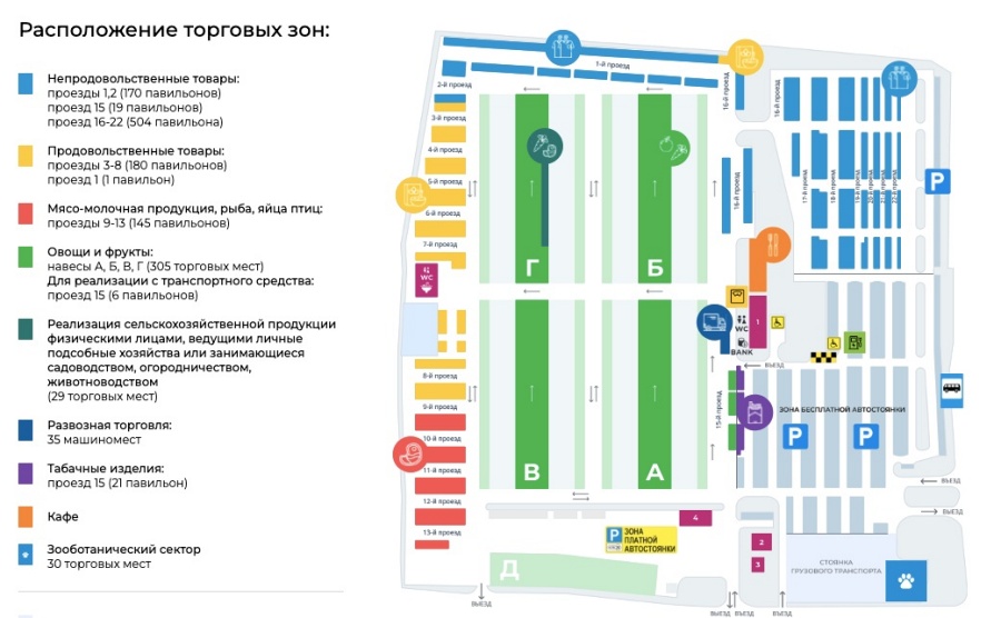 Рынок строился в чистом поле, поэтому не выглядит нагромождением всего подряд, как это было со «Ждановичами» до реконструкции. Парковка, зона кафе и туалетов, блоки с промтоварами и так далее: