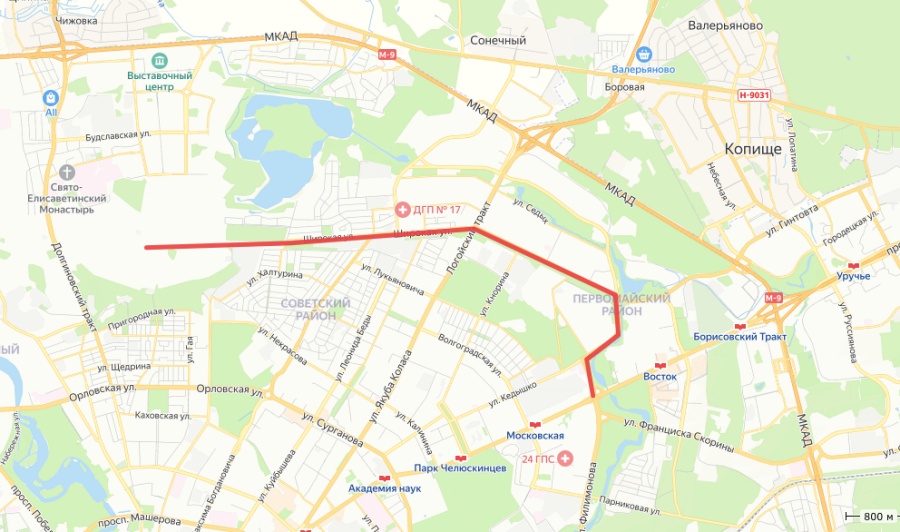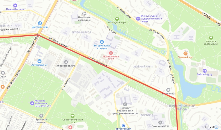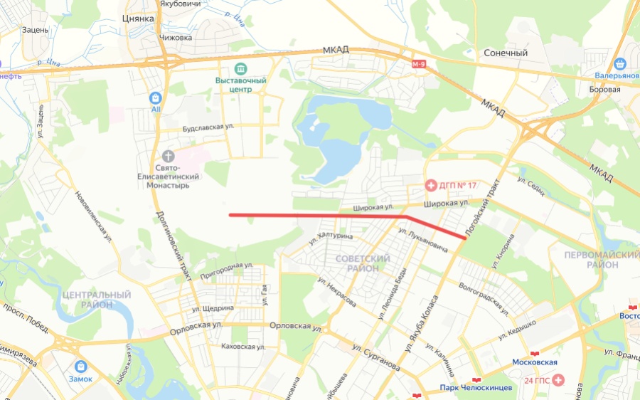 Вот так кольцо переходило бы из Северного Берега по Олешева к Логойскому тракту: