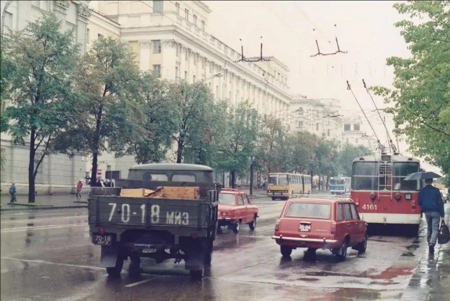 Побитая жизнью двойка проезжает через перекресток с Козлова/Варвашени в сотне метров от своего «дома», троллейбусного депо №1, ныне отданного под застройку ЖК Depo. Конкретно эта машина была построена в 1979-м и отработала по 1998-й:
