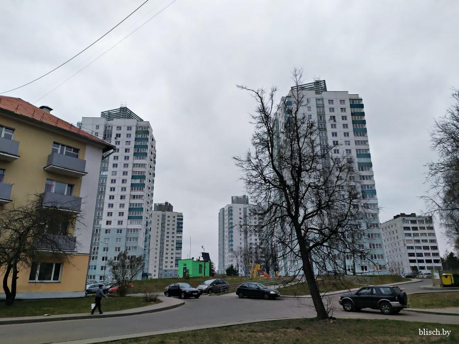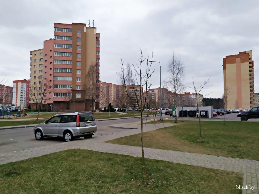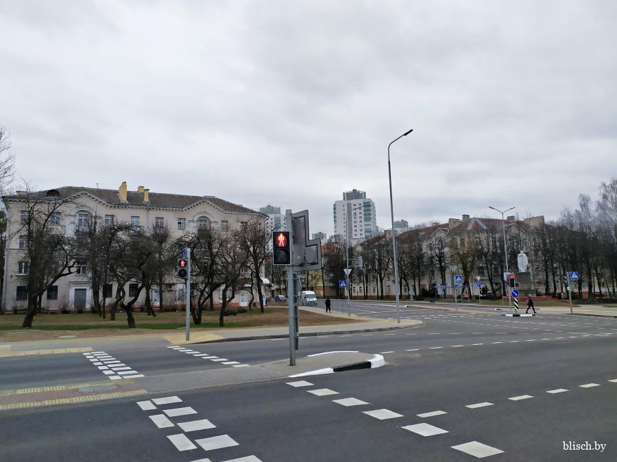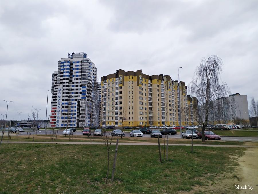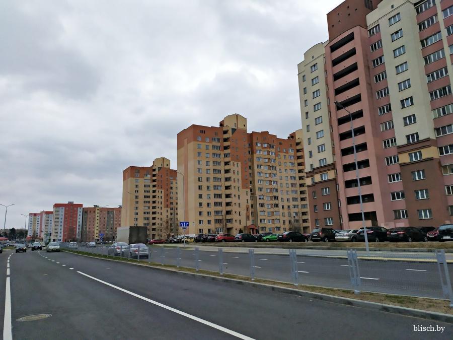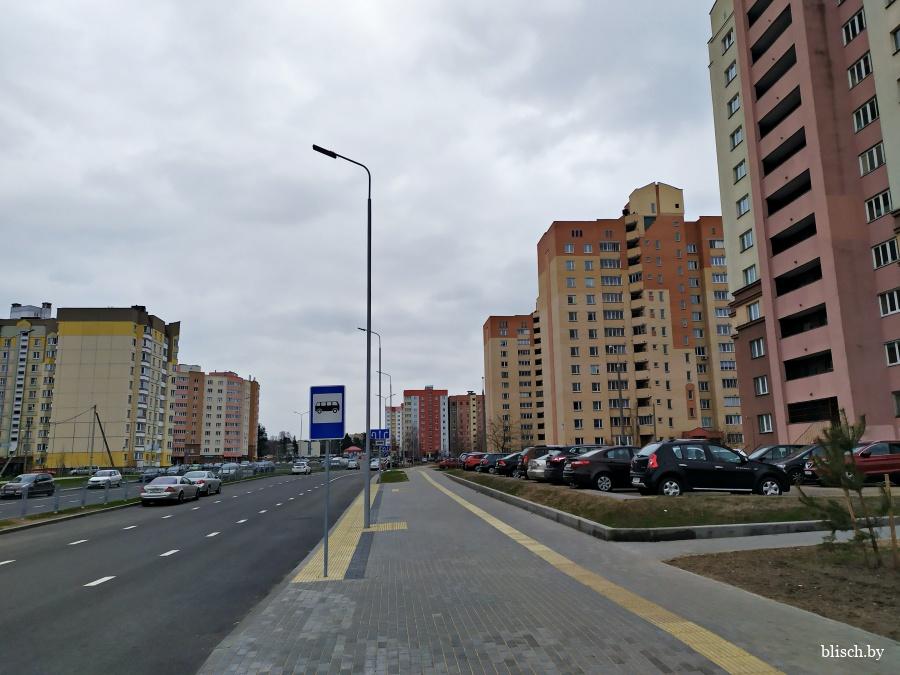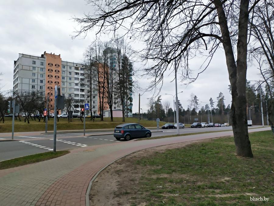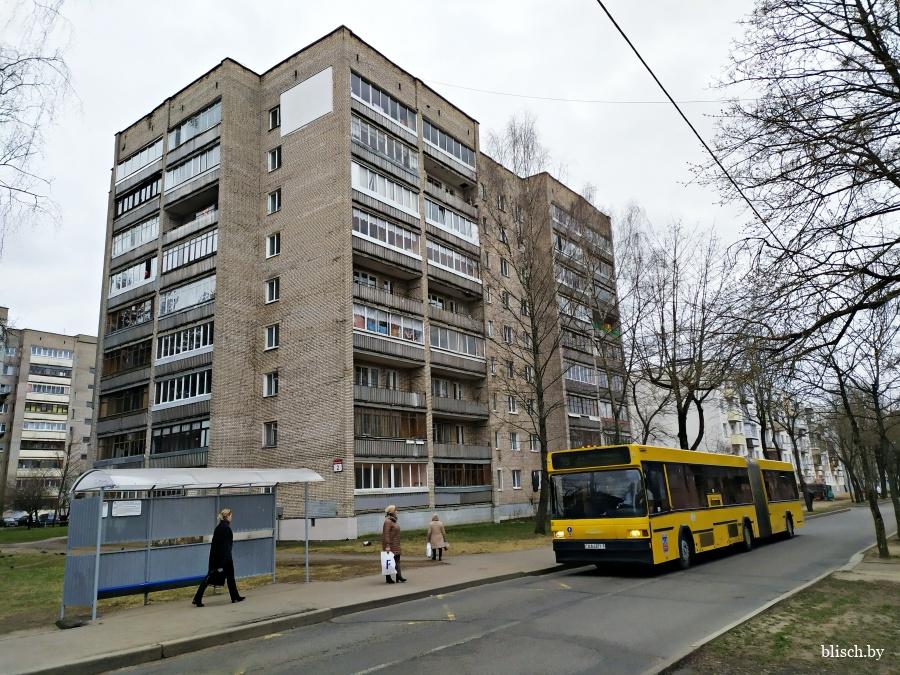 Высотный акцент — силикатная девятиэтажка по индивидуальному проекту. Автобус, к слову, катится по Почтовой улице, одной из редчайших в Минске улиц с односторонним движением.
