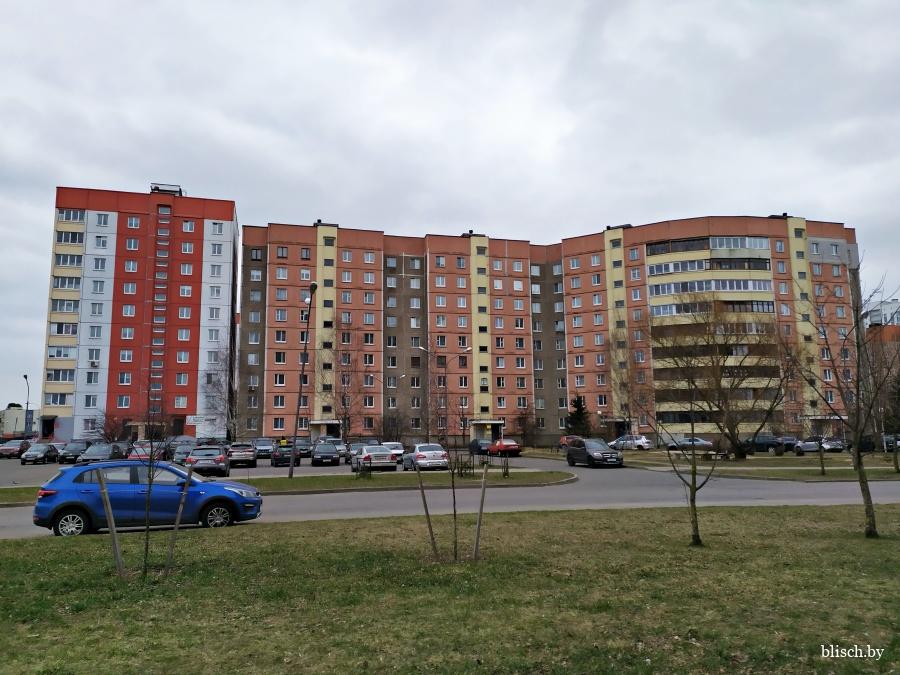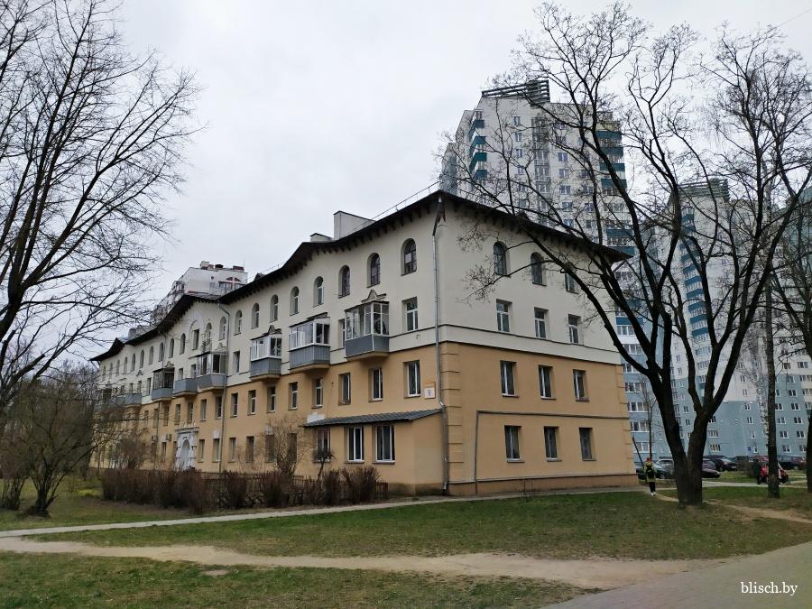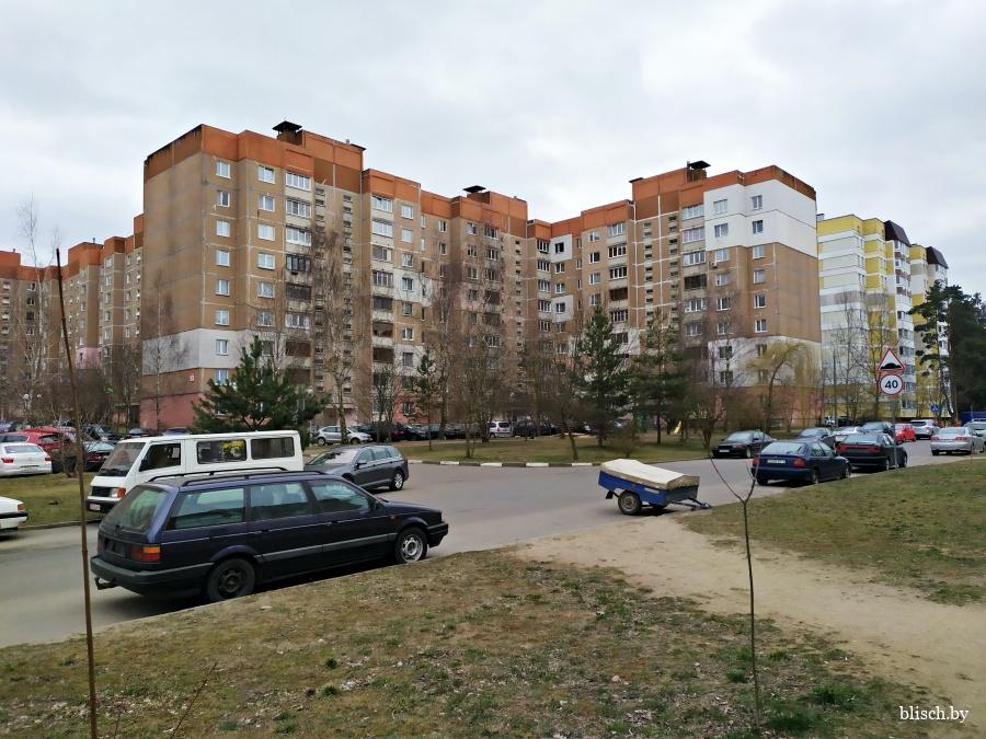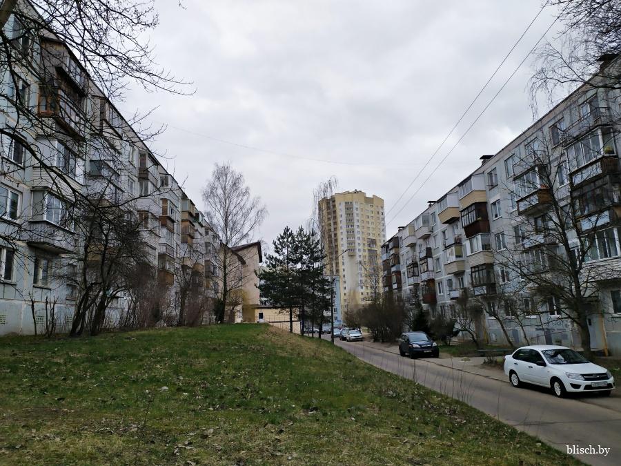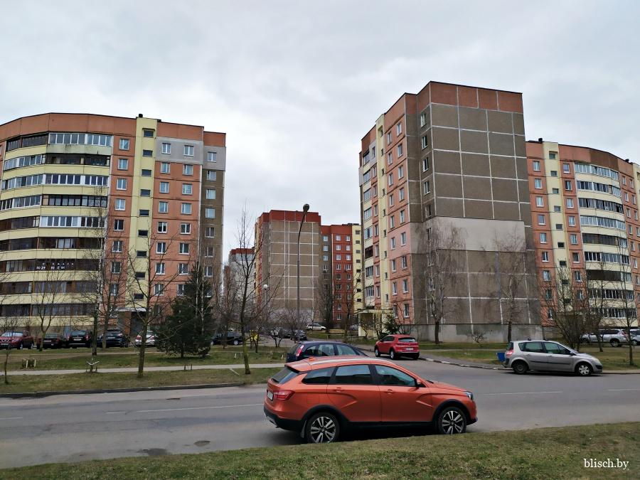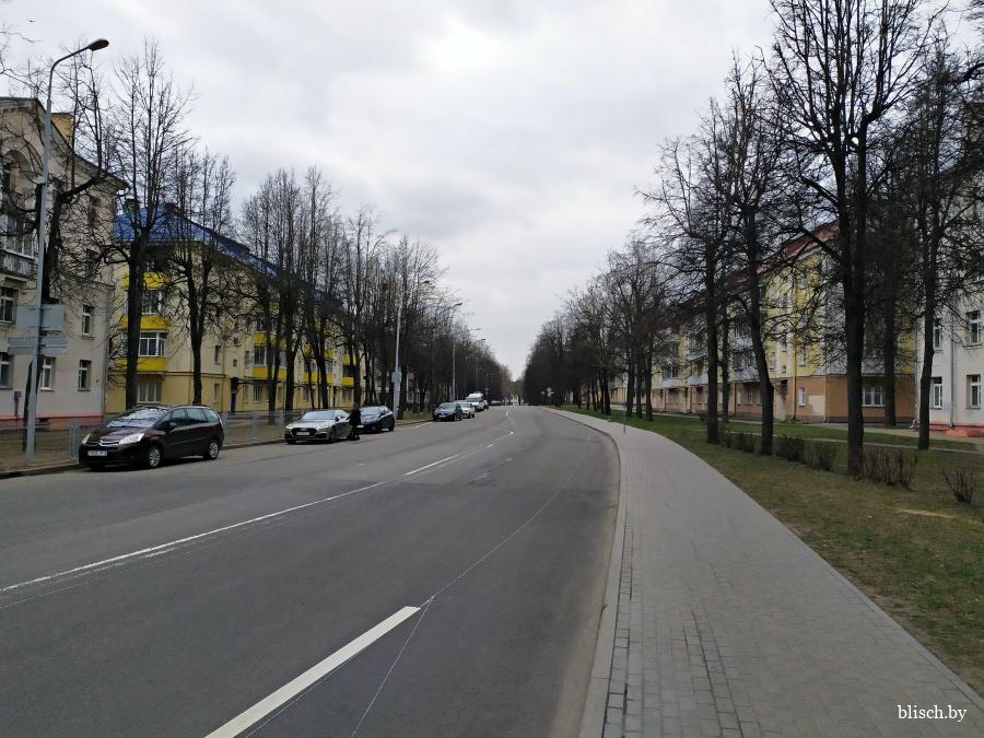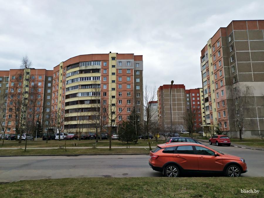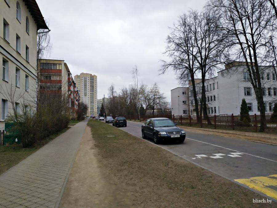 Высотный акцент — силикатная девятиэтажка по индивидуальному проекту. Автобус, к слову, катится по Почтовой улице, одной из редчайших в Минске улиц с односторонним движением.