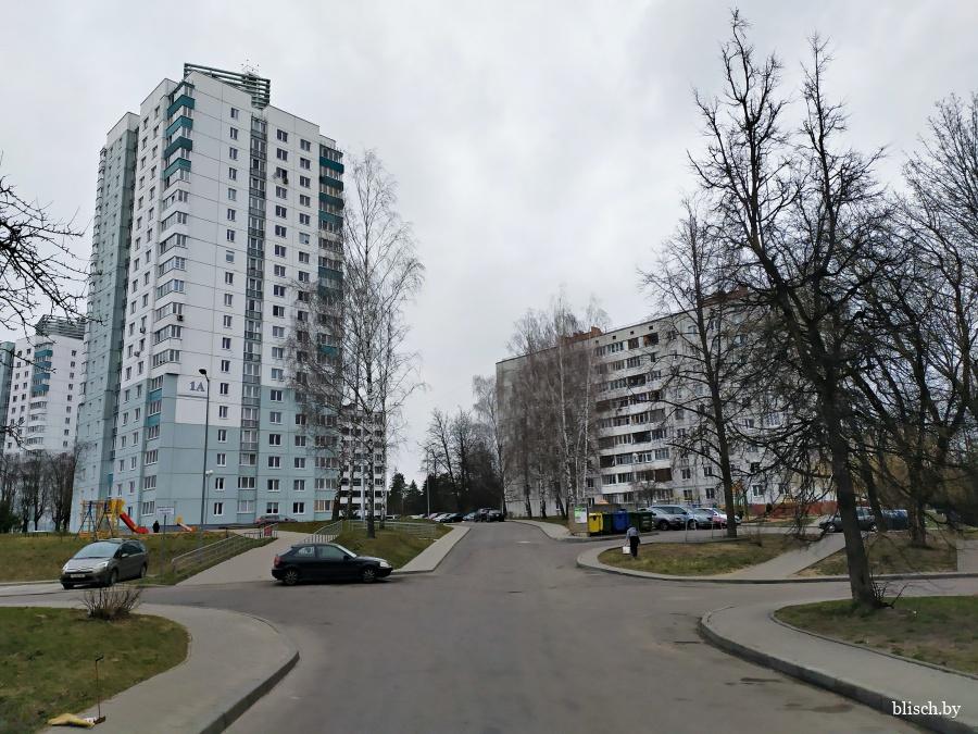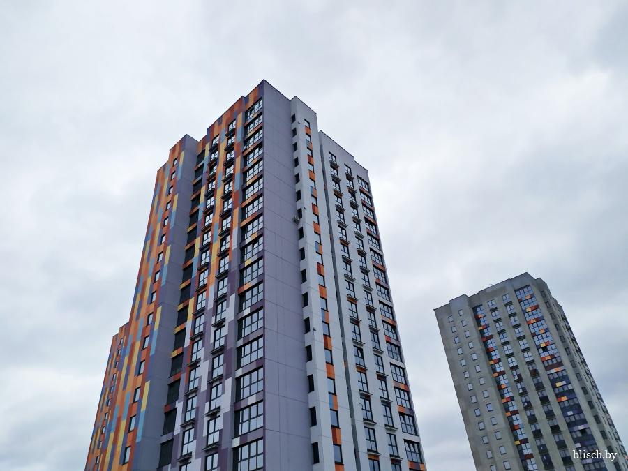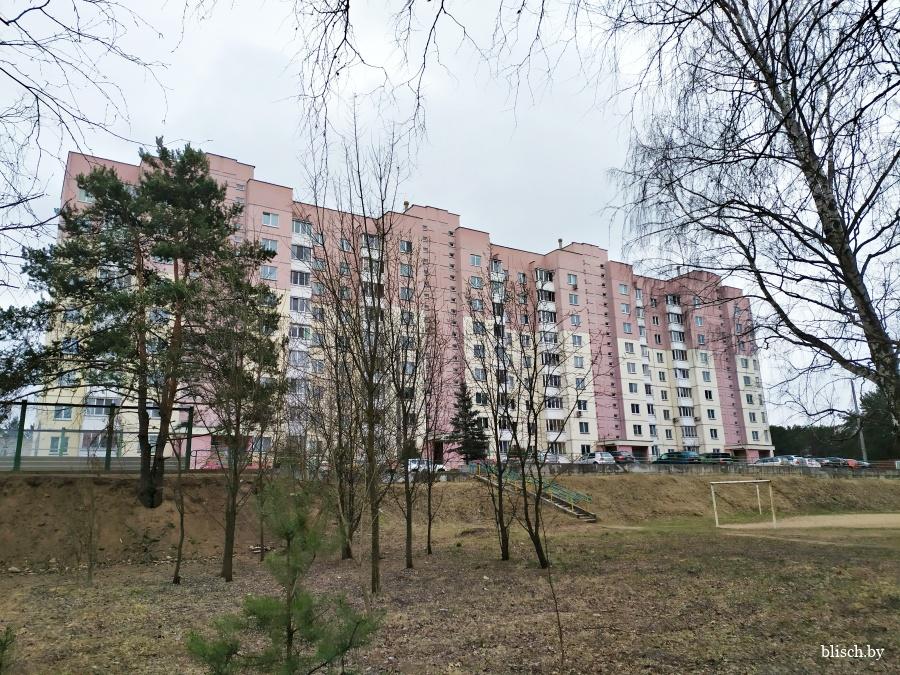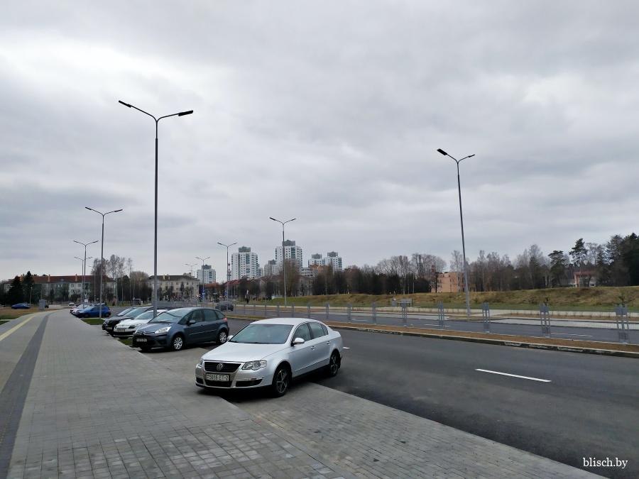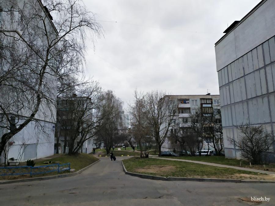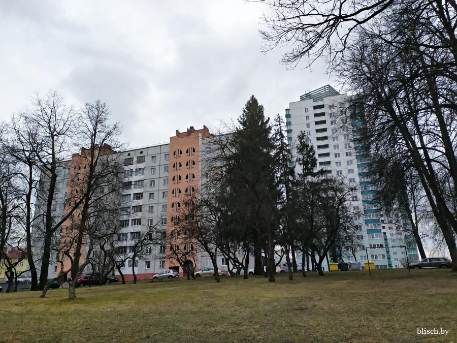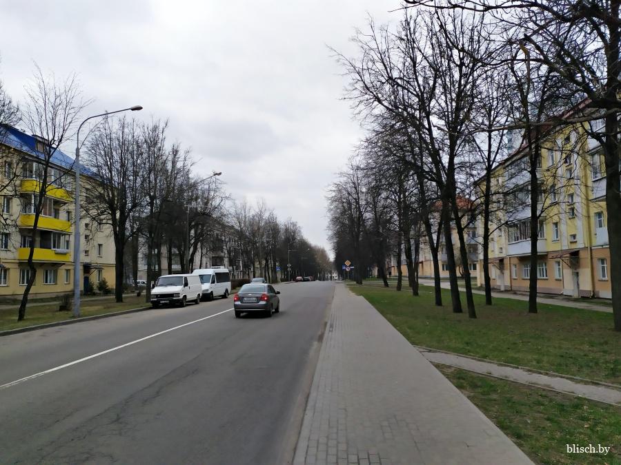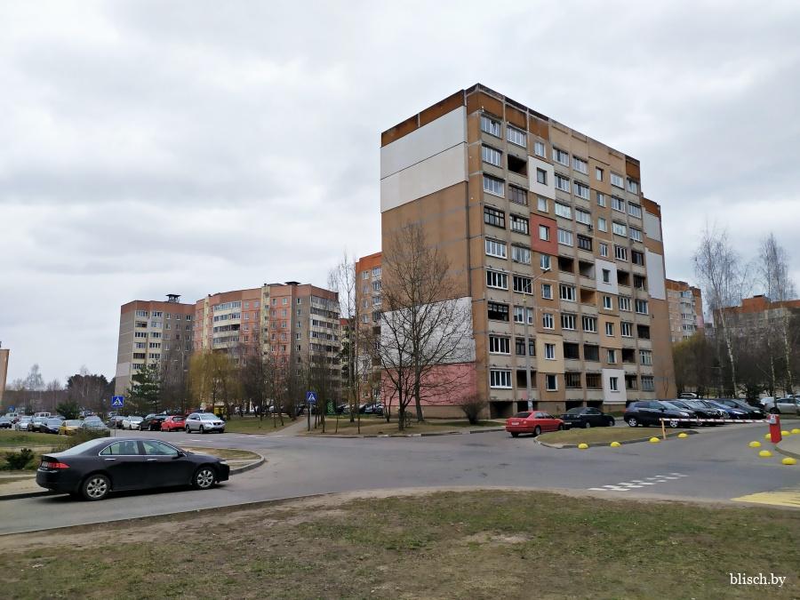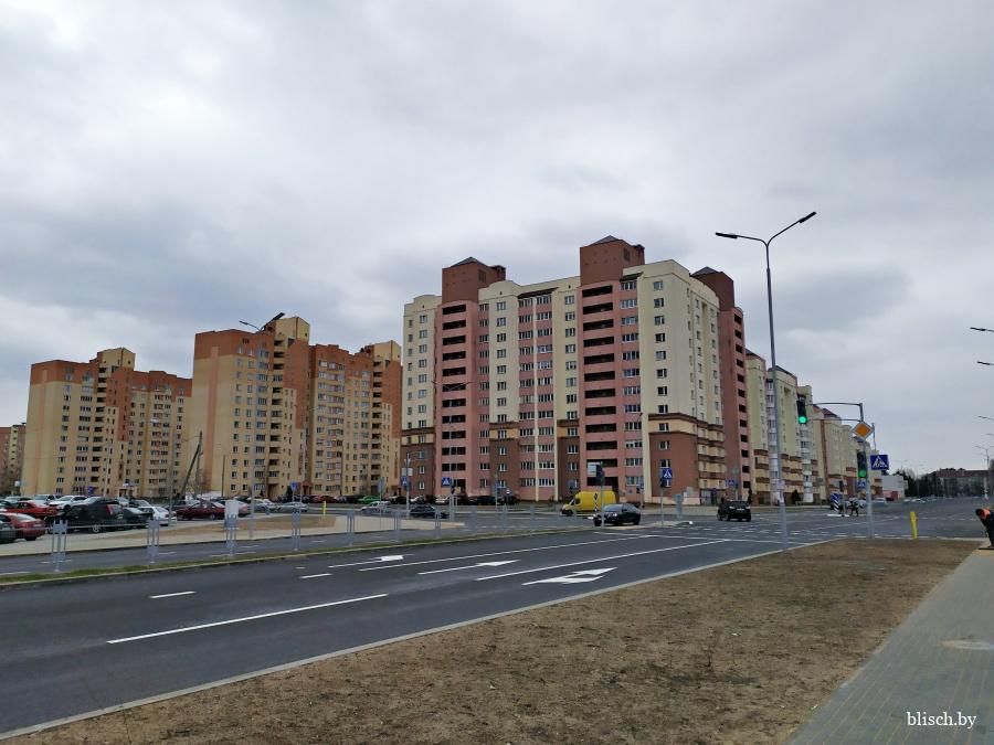 Высотный акцент — силикатная девятиэтажка по индивидуальному проекту. Автобус, к слову, катится по Почтовой улице, одной из редчайших в Минске улиц с односторонним движением.