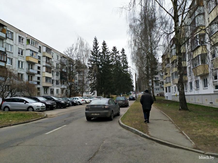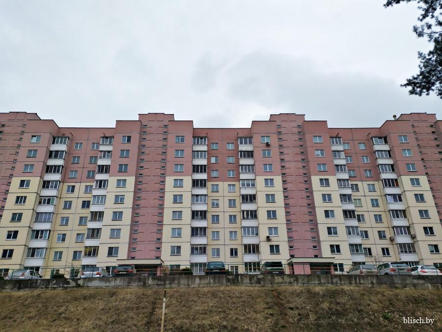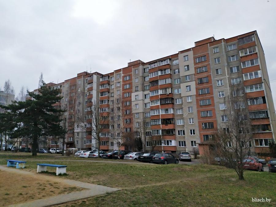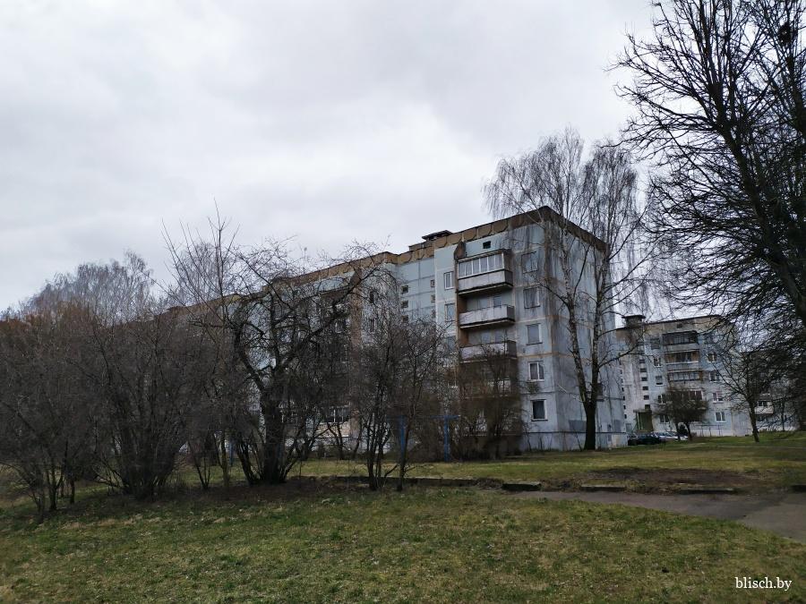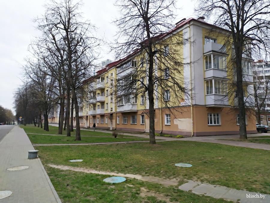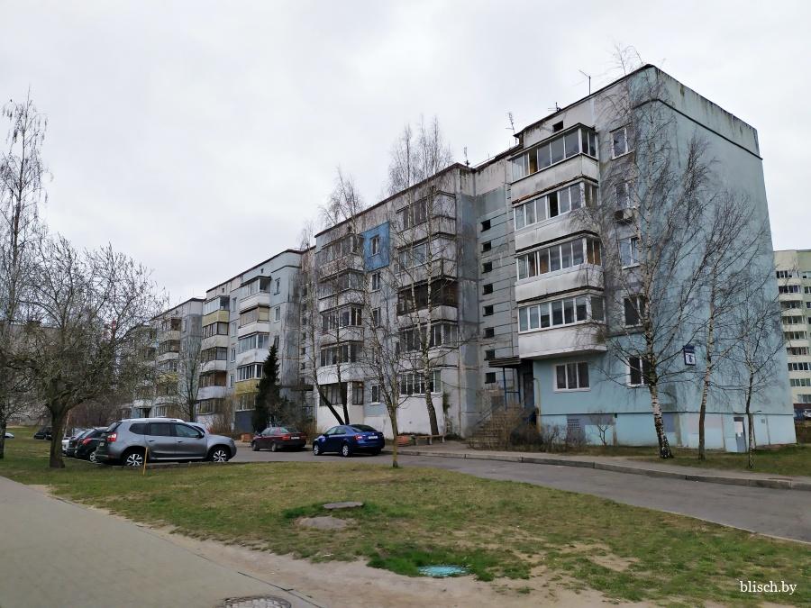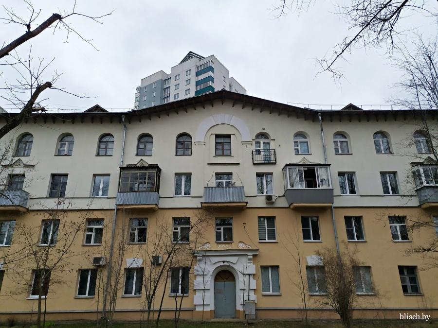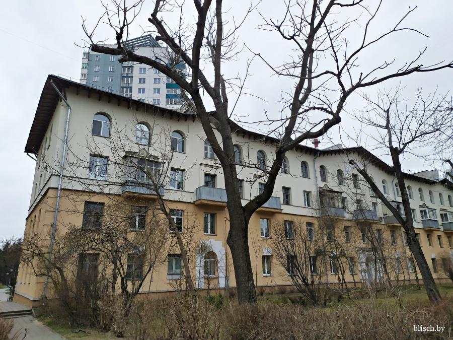 Высотный акцент — силикатная девятиэтажка по индивидуальному проекту. Автобус, к слову, катится по Почтовой улице, одной из редчайших в Минске улиц с односторонним движением.