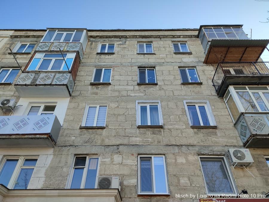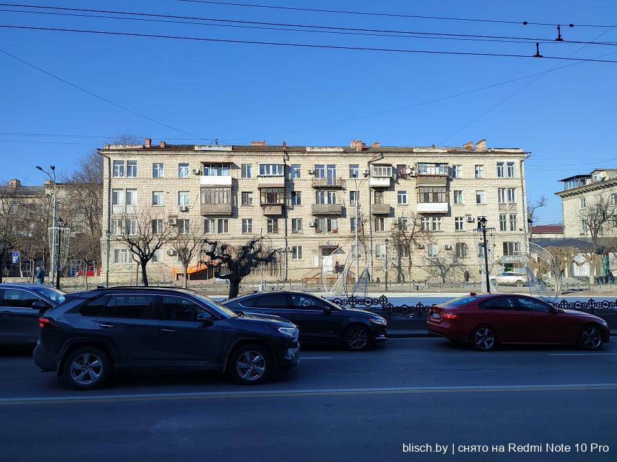 Чуть более торжественный дом, с какими-то колоннами, с большим шагом окон — ну, типа «сталинка». Обратите внимание, что надстройка мансардного этажа остановлена на полпути. Про остекление балконов и вставку каких-то угодно рам промолчу.