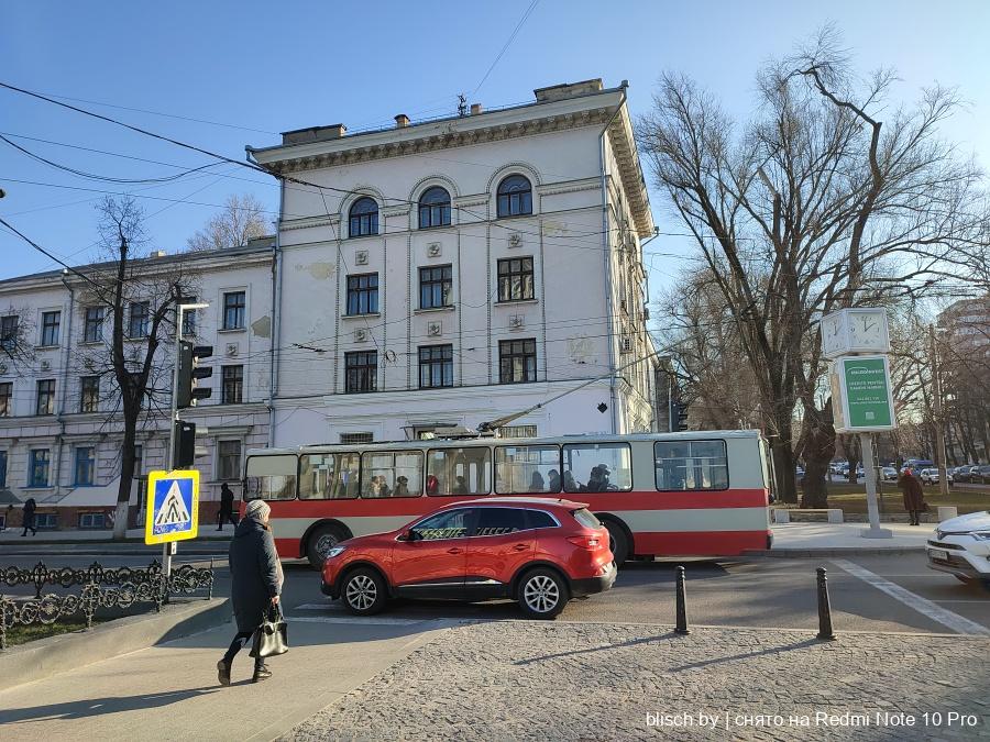 Троллейбус «Белкоммунмаша» спешит по своим троллейбусным делам на фоне арки: