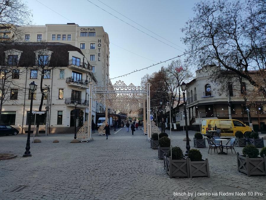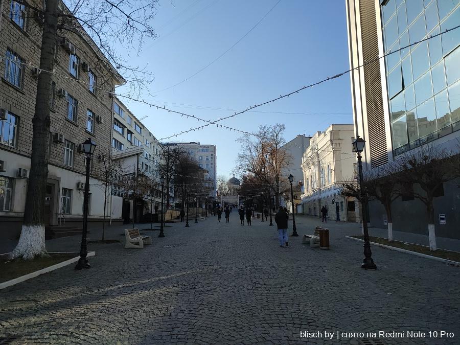 Пешеходка на самом деле очень короткая. Она носит имя Евгения Доги и вот это ее самый красивый угол, а может и самый красивый угол всего Кишинева как минимум в холодное время года: