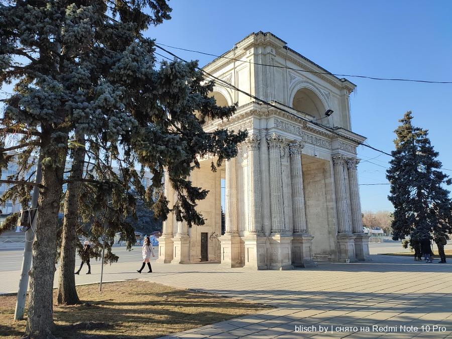 И уже на подходе к центральной площади главная достопримечательность города, Триумфальная арка, поставленная в честь победы в Русско-турецкой войне. Без натяжек, хорошее сооружение, гармоничное, с приятной текстурой и пропорциями: