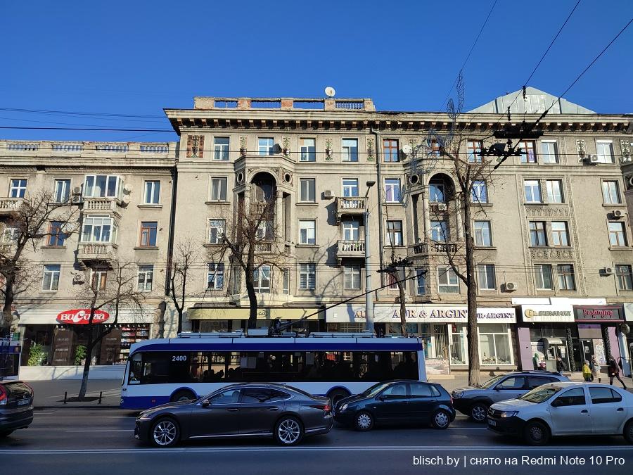 Ну, парадной в данном случае, конечно, это громко сказано. В плане оформления зданий или даже банального оштукатуривания фасада Кишинев определенно антилидер из всех столиц, где приходилось бывать. На очень важной улице дома стоят «в чем мать родила», в данном случае с открытой кладкой кирпичей из местного известняка: