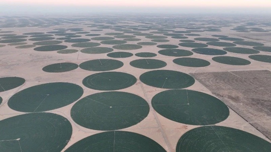 Вода из каналов-рукавов подается на автоматически движущиеся по кругу поливальные машины, создавая странный пейзаж, видимый даже из космоса: