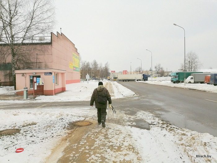 Транспортная проходная «Русского леса» и рыбак, шурующий по морозной улице. Надеюсь, он не на станцию аэрации.