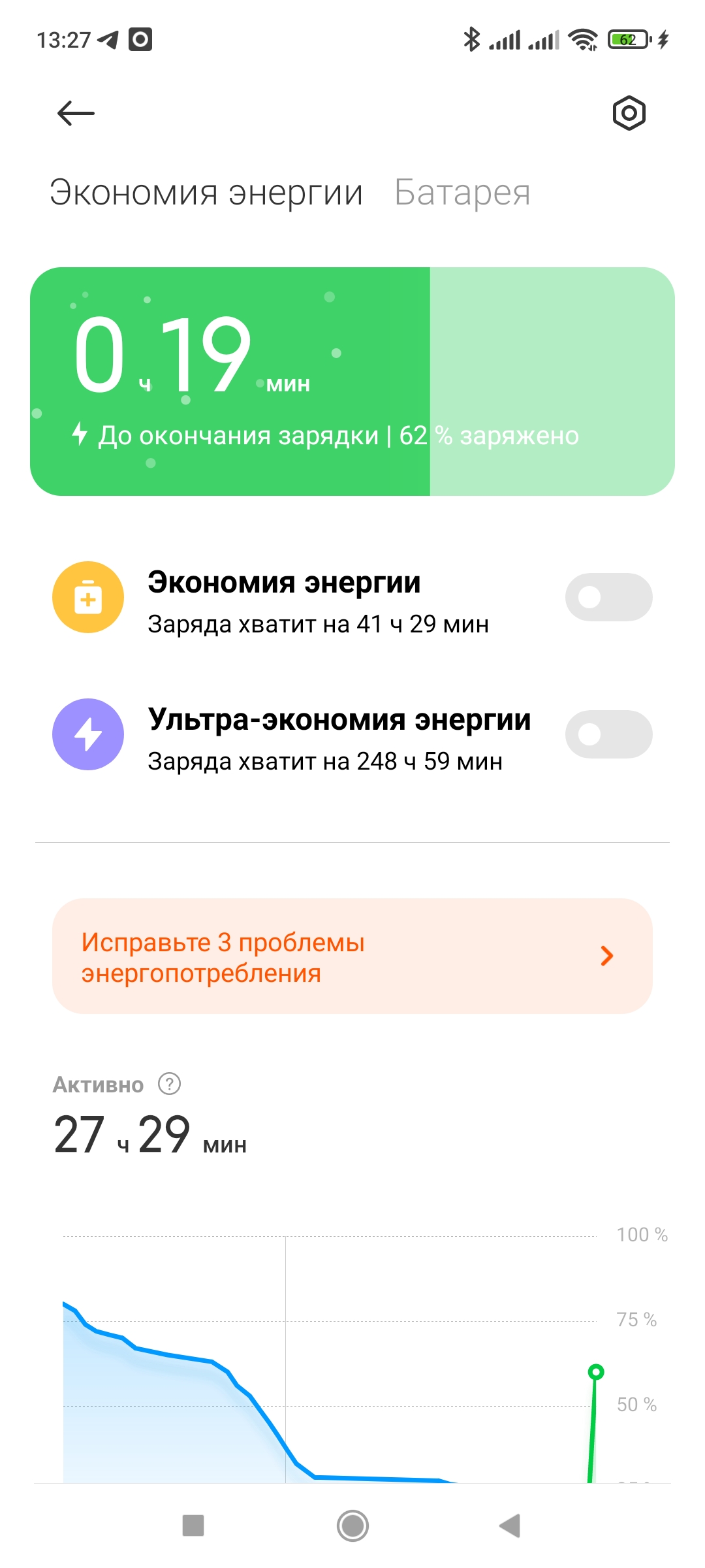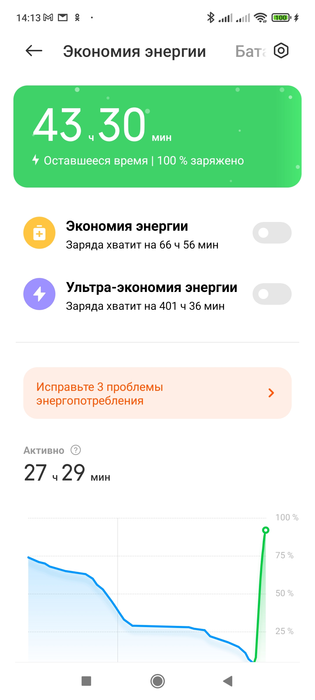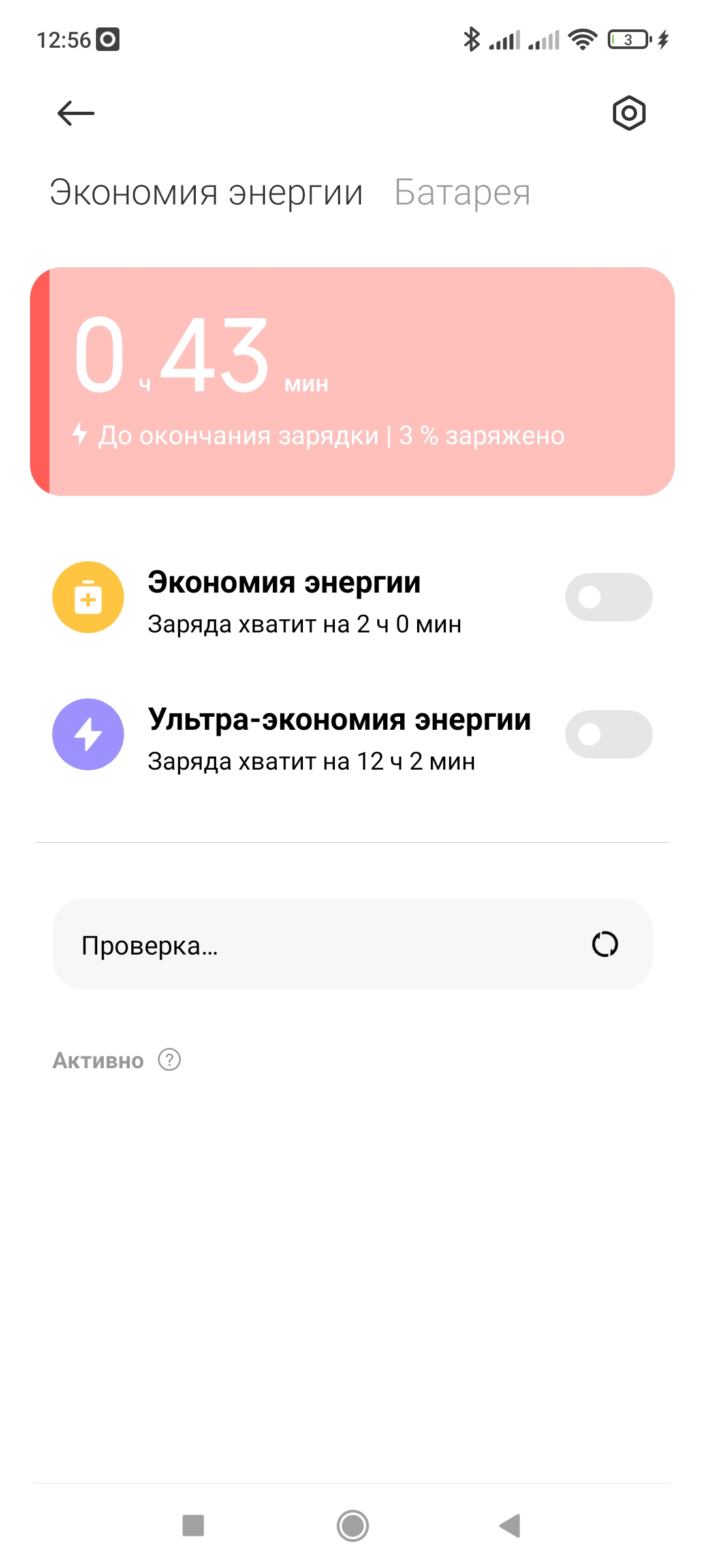 Разумеется, было интересно протестировать. Накануне я специально не поставил на ночь телефон в сеть, к полудню он полностью иссяк. В 12:56 включил новый девайс, системное меню предсказало, что на пополнение батареи уйдет 43 минуты: