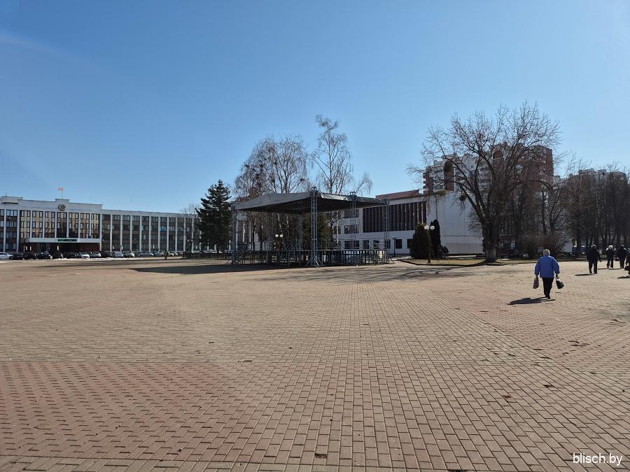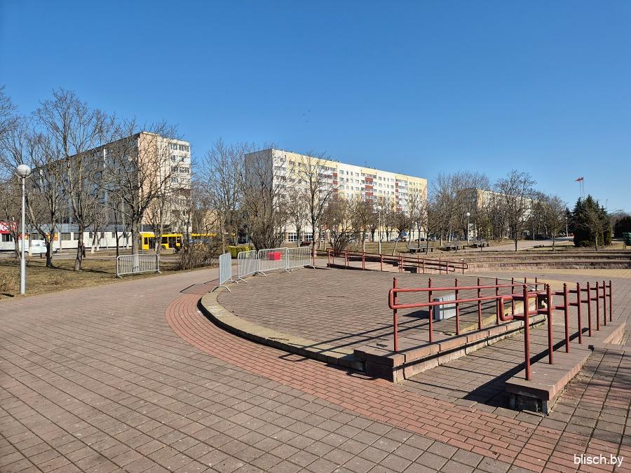 Площадь с уровня земли выглядит пустоватой из-за довольного большого размера. Заполняет ее только сцена для массовых мероприятий: