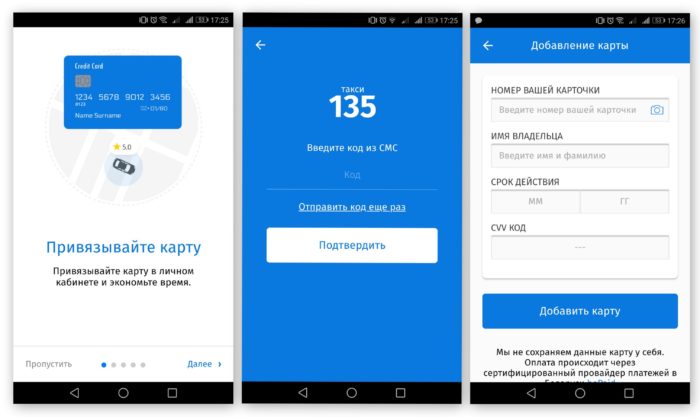 Приложение сразу после включения предлагает привязать карту. Действие потребует приема SMS с паролем и проверки баланса: с карты спишется и тут же вернется 1 рубль.