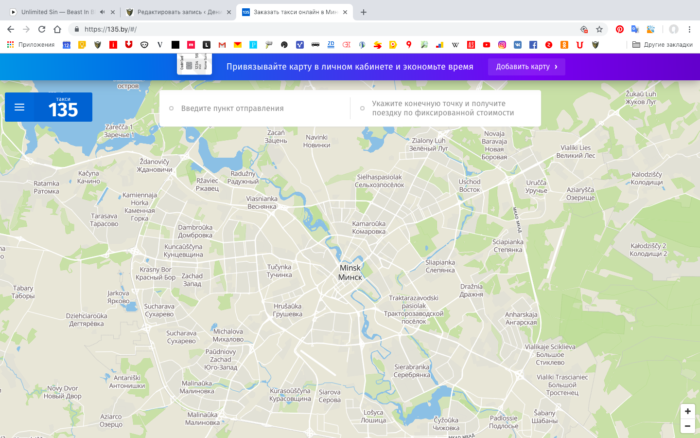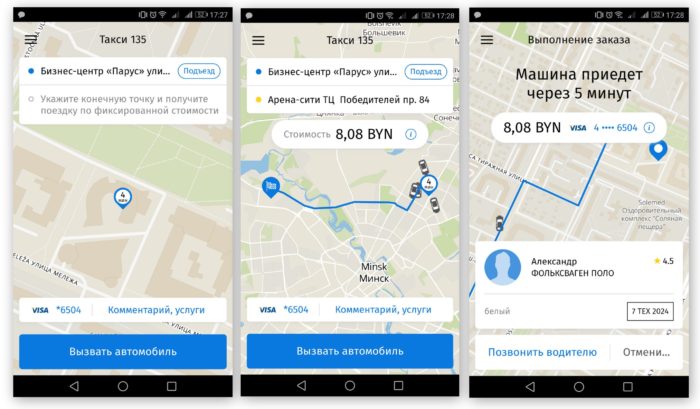 После привязки карта не становится способом оплаты по умолчанию. Сделать ее таковой можно при первом вызове такси на экране карты. Сам процесс вызова никаких существенных отличий от других приложений не имеет. Показывается ожидаемое время подачи машины, наличие поблизости свободных автомобилей, а также расчетная цена до места назначения. По сути разница только в одном — в картоснове. У 135 используется неизвестная мне карта.