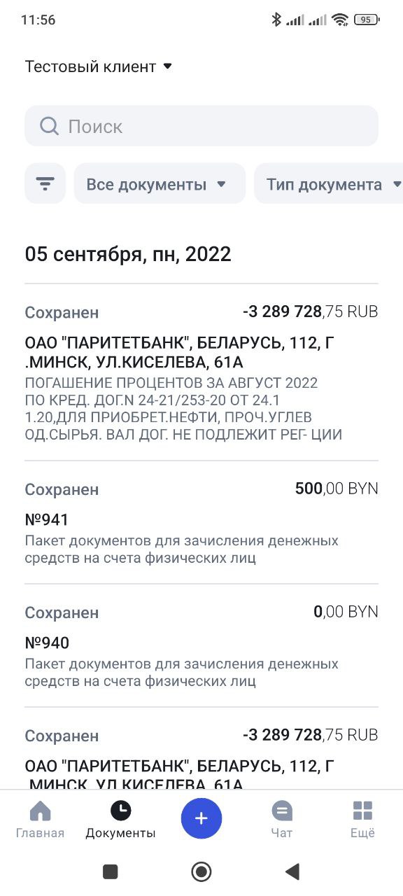 Зашел в раздел документов. Те платежки и прочие доки, которые нужны вам в повседневной работе. В тестовой версии почему-то сохраняется все, что генерируют люди, пробующие приложение, включая всякий мусор с нулевыми суммами. Мусор это точно лишнее, нужно хотя бы минимальное вмешательство разработчика для чистки раздела от совсем нерелевантных позиций.